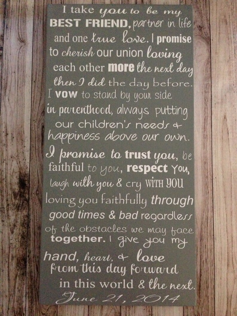 Personalized Wedding Vows for the bride and groom word art from img.etsystatic.com Wedding vows are our favourite part of the ceremony. When you sit down to try to explain what the love of your life means to you, the most important part is to stay true to yourself and to who you are as a couple. While "writing marriage vows" languished at the bottom, the top of the list was all that logistical (and sometimes fun and pretty stuff): Each of these wedding vow examples have their own unique feel and tone so. It's when you get to tell your love story and decide what your marriage looks like. Jun 02, 2021 · share personal stories. Jan 30, 2018 · use the filters below to choose between 100 romantic wedding vows. Try adding some phrases to your wedding programs for an extra touch of romance or to your wedding thank you cards after your big day.